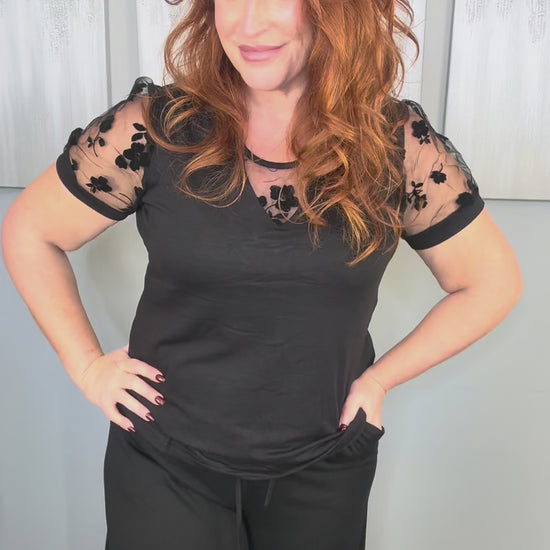A little flirty, a little classy, and a whole lot of wow. This top brings the perfect mix of feminine mesh florals and sleek black fabric — giving you that elegant, effortlessly elevated look. Sheer embroidered sleeves + mesh neckline, soft flowy body with the perfect drape