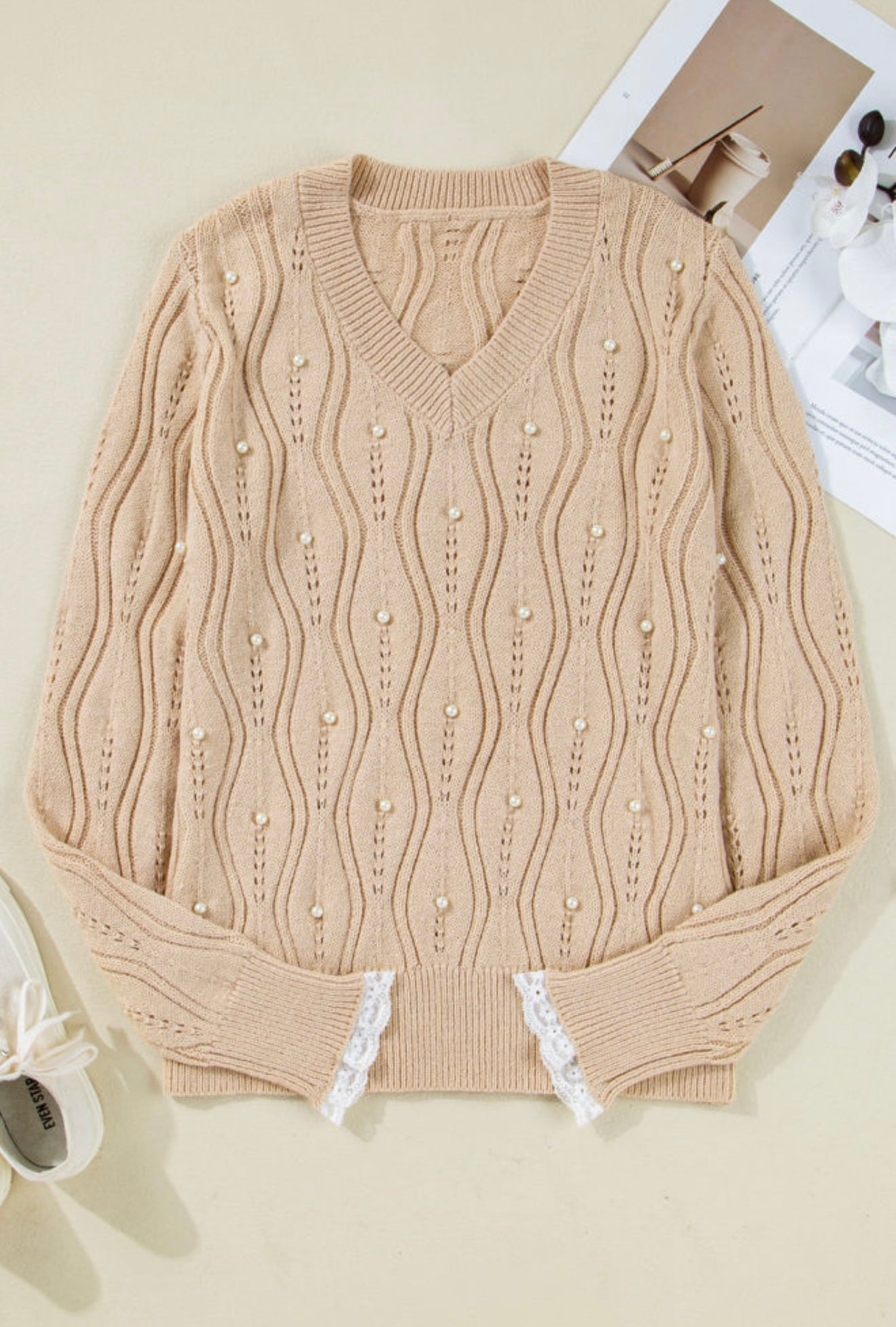 Meet the soft + feminine knit that instantly elevates your whole winter wardrobe. This cozy cable sweater features delicate pearl accents and a wavy open-knit pattern that gives you that effortlessly luxe, romantic look. The little lace peek-a-boo at the cuffs? Chef’s kiss. Perfect with skirts, denim, or layered over a collared top for full-on classy vibes.