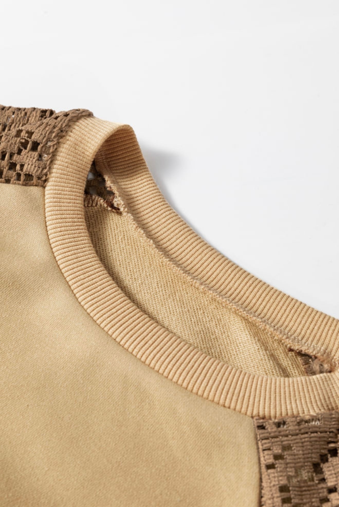 Soft neutrals, cozy texture, and just the right touch of detail — the Sunset Stroll Patchwork Pullover brings boho charm to everyday comfort. Featuring warm sand and caramel tones, this relaxed sweatshirt-style top stands out with its mix of smooth cotton-blend fabric and crochet-inspired contrast sleeves that add an effortless, handcrafted vibe.