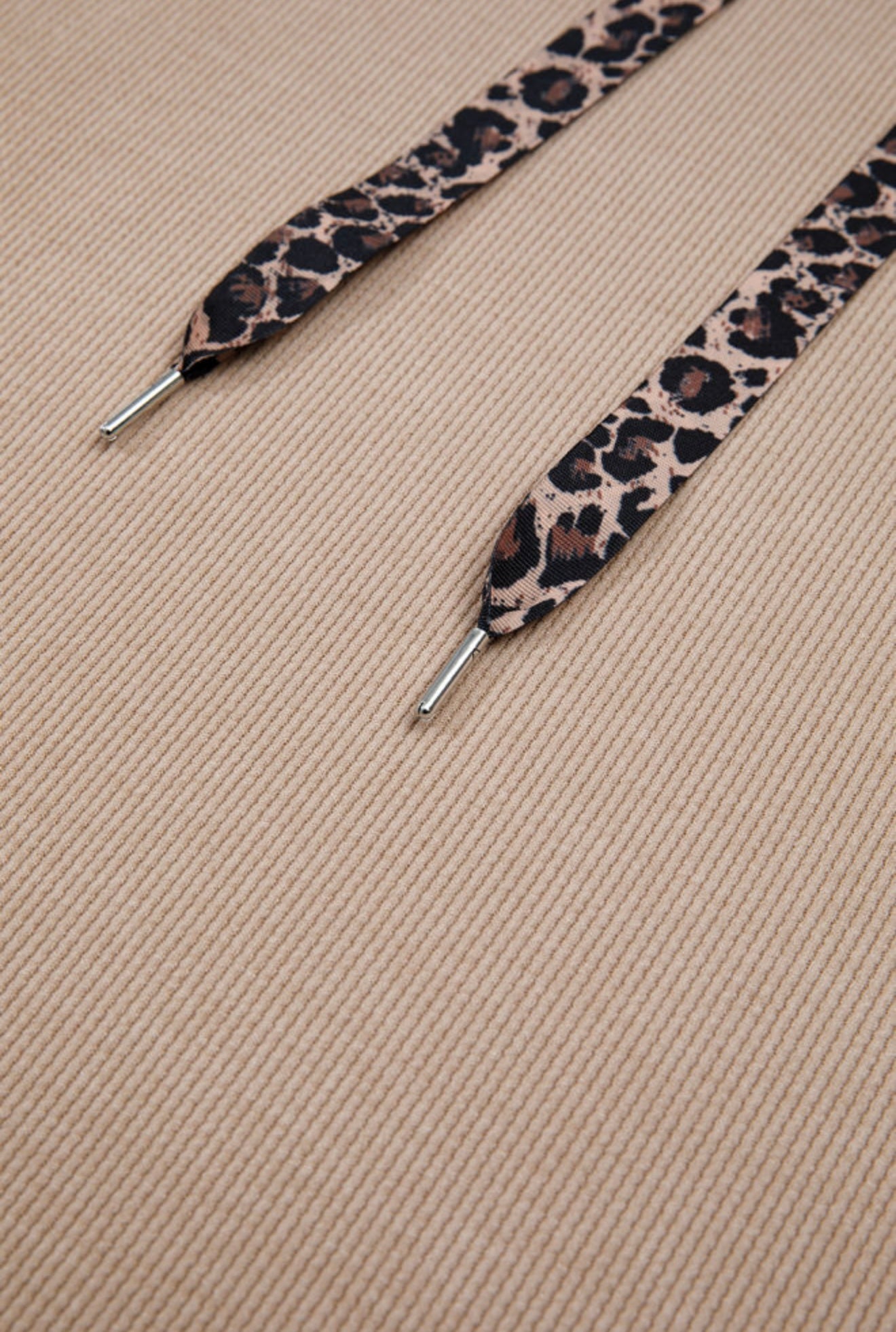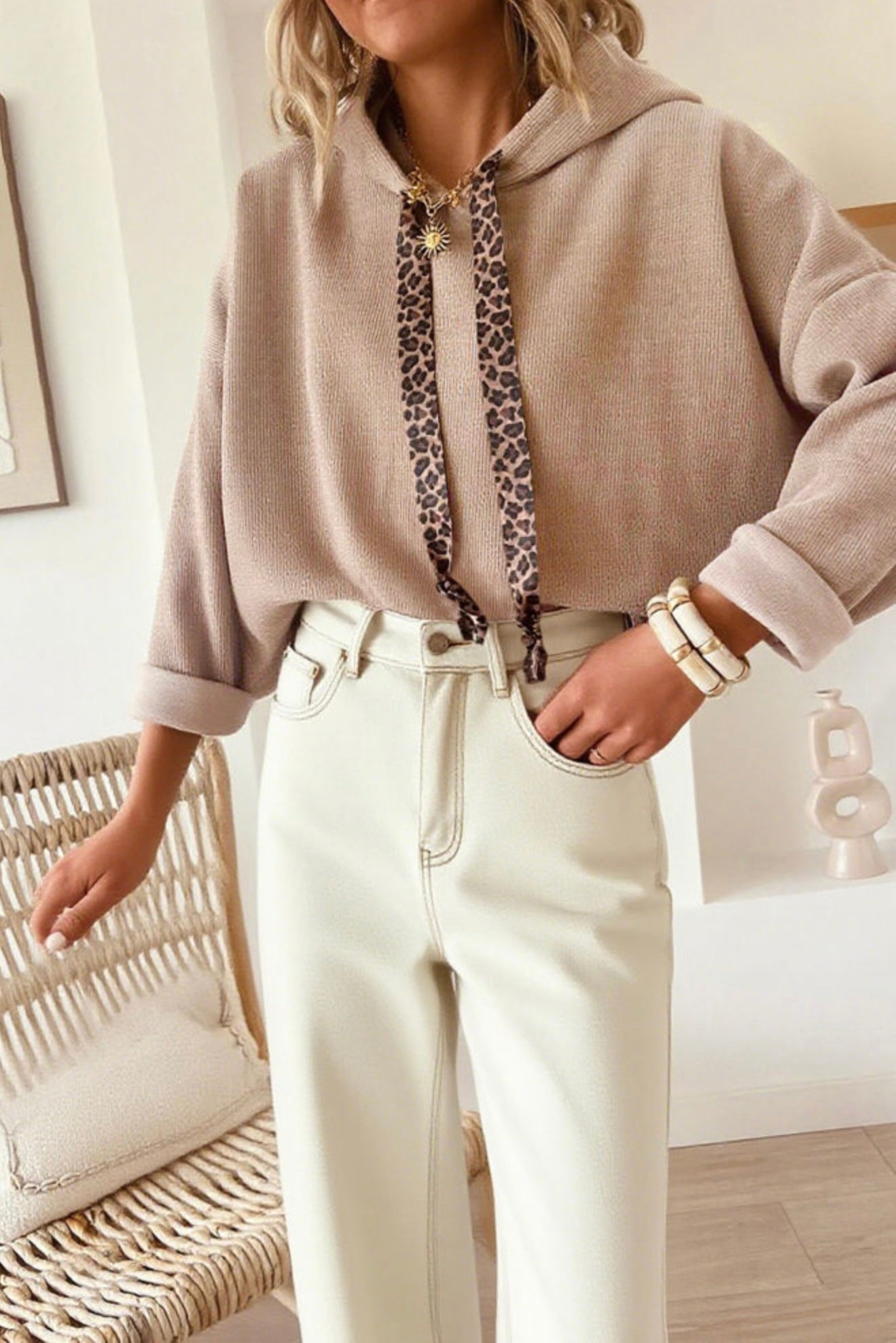 Where cozy meets confident — the Wild at Ease Knit Hoodie brings everyday comfort with a fierce twist. Designed in a soft neutral beige with relaxed dropped shoulders and a subtle oversized fit, this hoodie’s statement leopard-print drawstrings add just the right amount of bold personality.